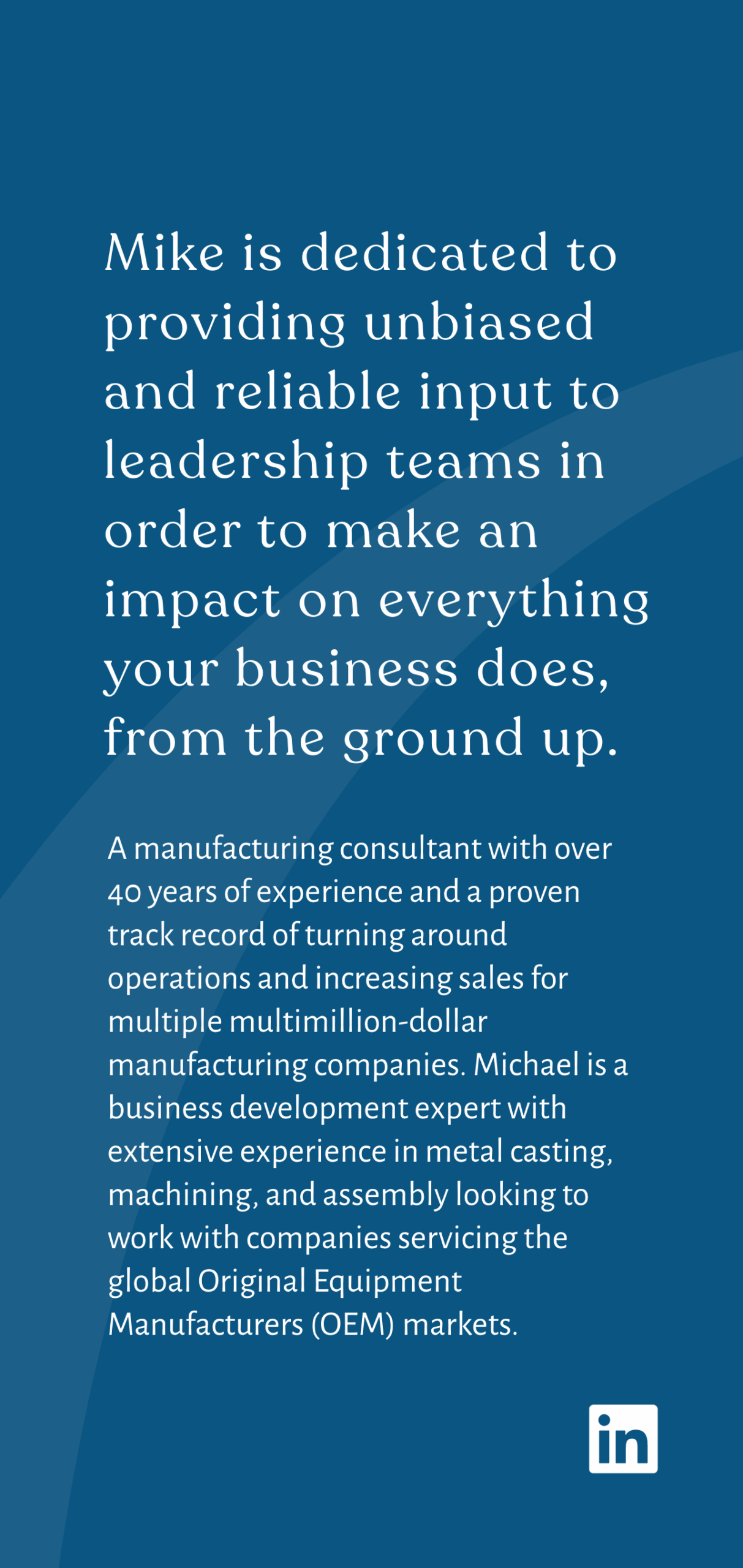 Mike is dedicated to providing unbiased and reliable input to leadership teams in order to make an impact on everything your business does, from the ground up.